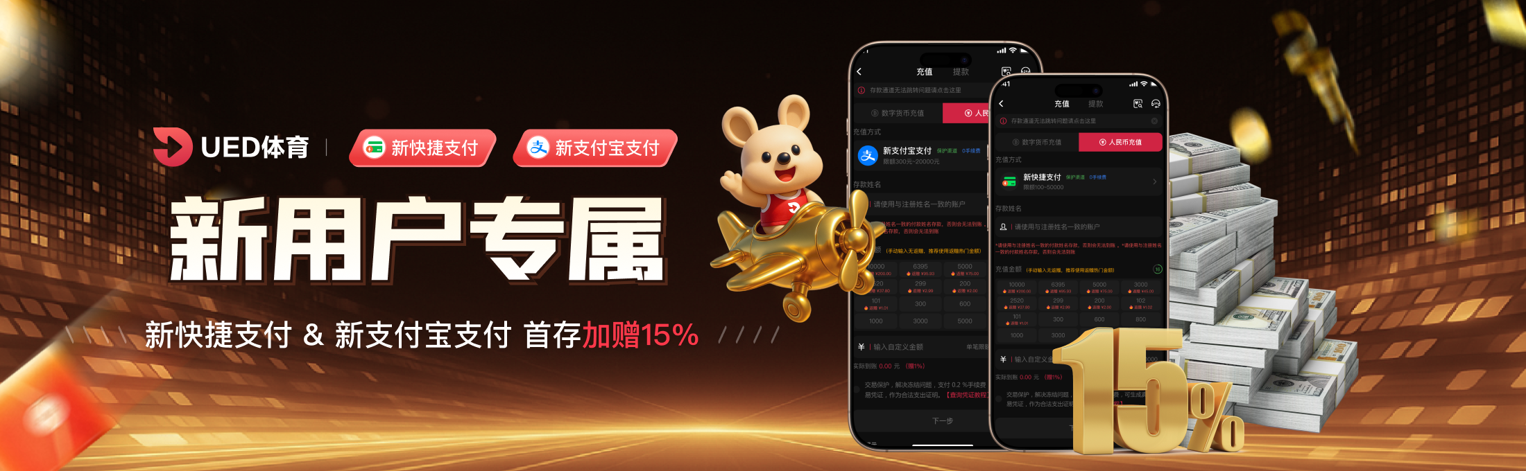 四、活动内容:所有首次使用“新快捷支付”和“新支付宝支付”方式进行存款的会员,即可获得首笔存款金额的15%