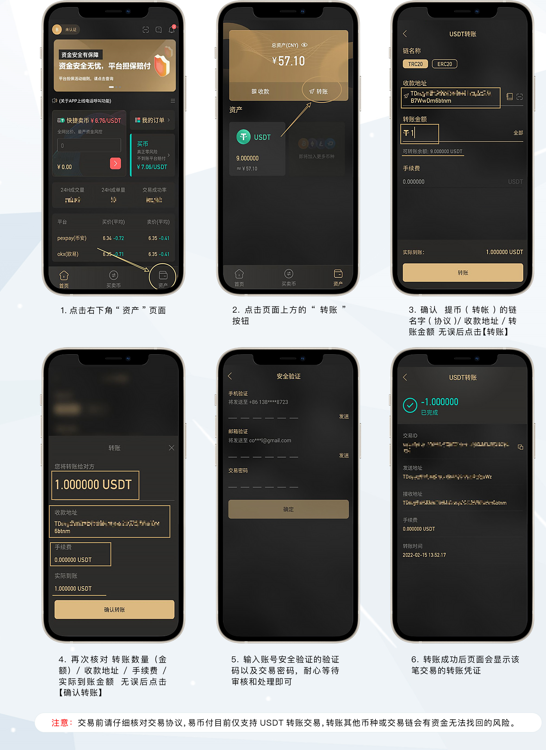 注意:交易前请仔细核对交易协议,易币付目前仅支持USDT转账交易,转账其他币种或交易链会有资金无法找回的风险。