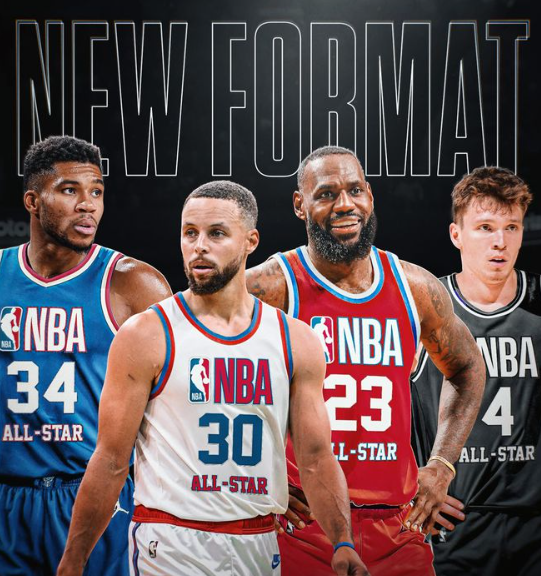就像之前报道的那样,今年的全明星类似锦标赛,共有四队参赛,除了24名全明星球员分成的三队(每队各8人),余下一队是新秀赛的获胜球队。