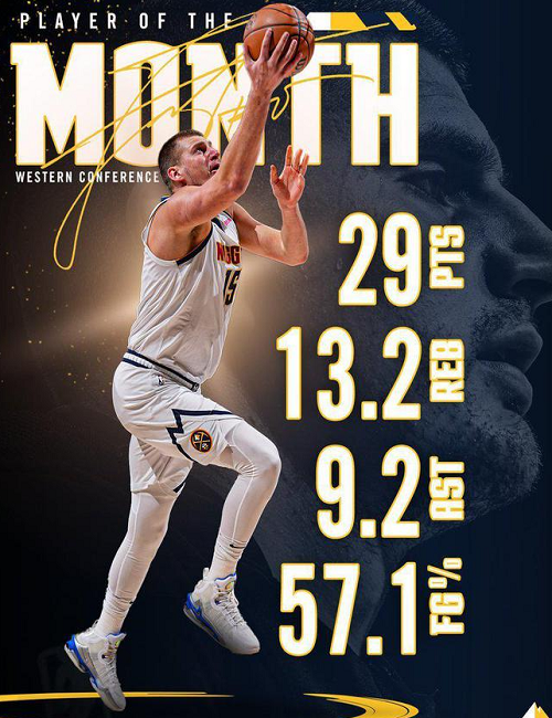 掘金官方还晒出了约基奇的本月成就:获得7次三双,而NBA其他球员加在一起只有8次。连续4场比赛得分30+,其中两场是30+三双且零失误,在过去40年没有人做到过。约基奇还是1967年以来首位开季连续12场比赛打出至少20分10篮板的球员。