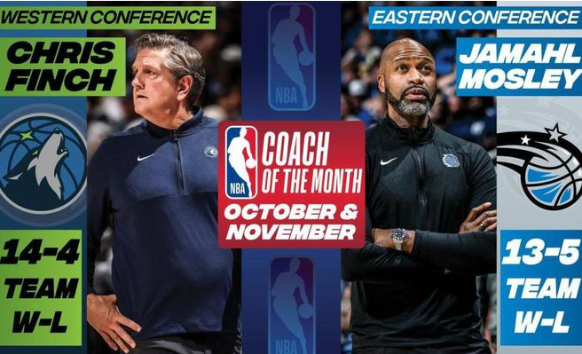 10-11月的月最佳主教练,属于魔术的莫斯利与森林狼的芬奇。魔术的战绩是13胜5负,排名东部第二;森林狼的战绩是14胜4负,西部最佳。